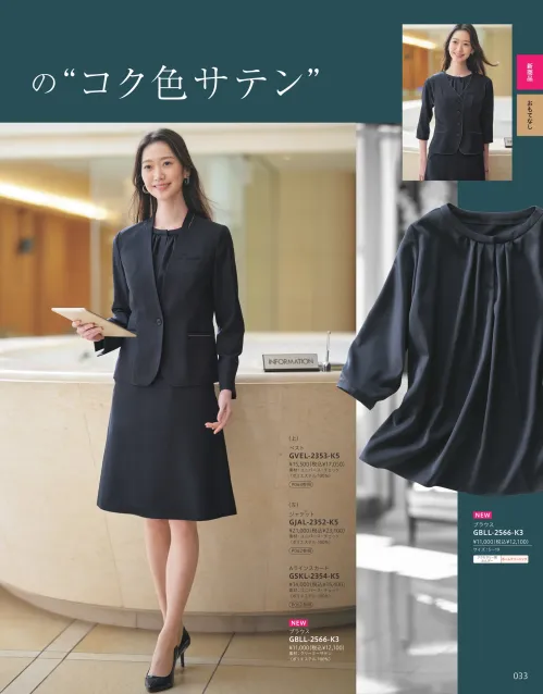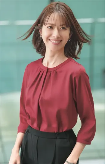 上質な光沢を放つCREAMY SATINのブラウス。ポリエステル100%のなめらかなストレッチサテンが体の動きにしなやかに追従し 接客や受付シーンで凛とした印象を演出。胸元のギャザータックでウエストのラインを拾いにくく シックなネイビーカラーが品よく映える着心地と美しさを両立します。
