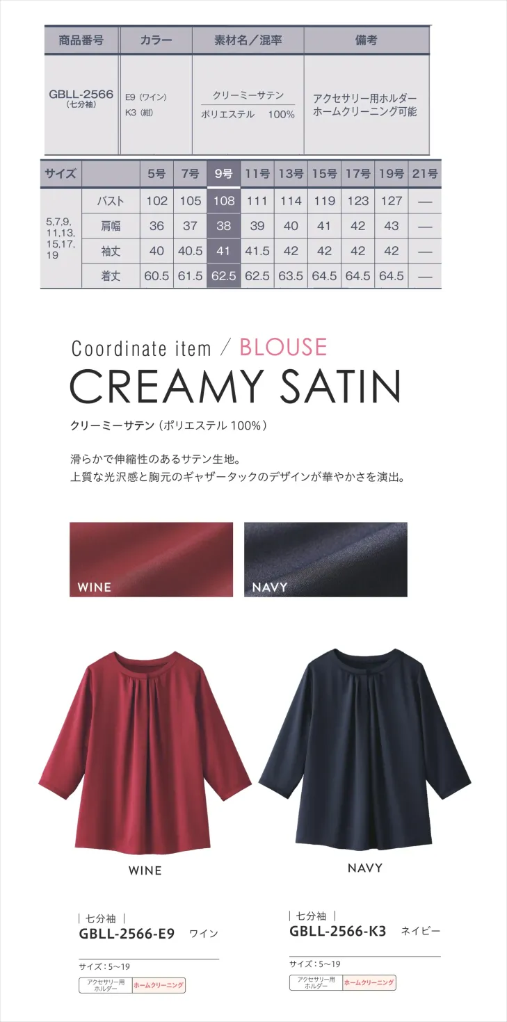 GBLL-2566-K3 クリーミーサテン ブラウス 七分袖 ネイビー
