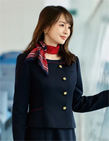 華やぎコンシェルジュ®コレクションの洗練されたベストで、上品なおもてなしスタイルを実現。信頼感あふれるネイビーベースに赤のパイピングと金ボタンが高級感を演出し、フロント業務やアテンドシーンで品格ある存在感を放ちます。ツイードニット素材の独特な凹凸感と適度なハリが、きちんとした印象と快適な着心地を両立させた優秀な事務服です。
