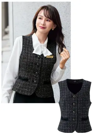 フロントやインフォメーション業務に特化したen joie華やぎコンシェルジュ®コレクションのラグジュアリーなベストです。黒ベースのマイクロチェック柄に色鮮やかな意匠糸とラメを織り交ぜたビジューツイード素材を採用し、上品な華やかさと洗練された存在感を演出します。