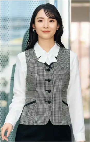 en joie OFFICEFUL COLLECTIONのエレガントなベストは、ウールライクな質感と軽やかな着心地を実現したポリエステル100%のチドリチェック素材を採用。一般オフィスから医療関係まで幅広いシーンで活躍し、上品なクラシカルデザインと実用的な名札ポケットで、プロフェッショナルな装いを完成させます。
