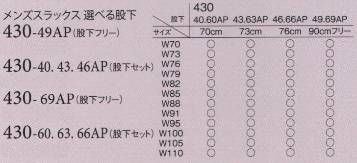 メンズスラックス 選べる股下(股下セット70cm) アプロン430-40APのサイズ表
