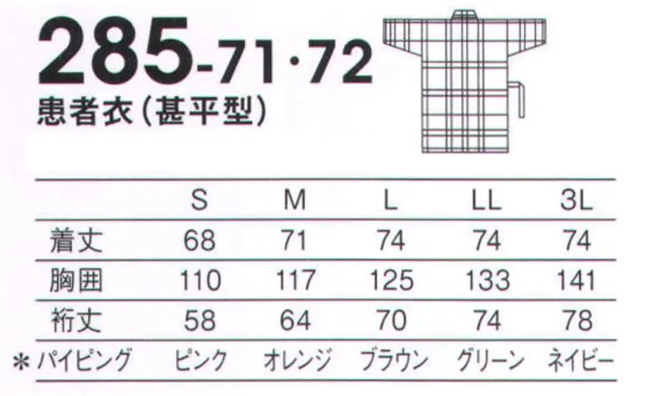 患者衣(甚平型) KAZEN285-71のサイズ表