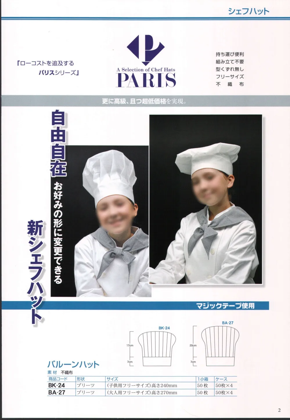 ローコストを追求するパリスシリーズ。更に高級、且つ超低価格を実現。自由自在お好みの形に変形できる新シェフハット。持ち運び便利。組み立て不要。型くずれなし。フリーサイズ。不織布。