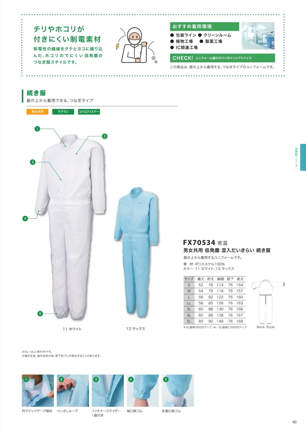 男女共用 低発塵 混入だいきらい続き服 フードマイスターFX70534のサイズ表