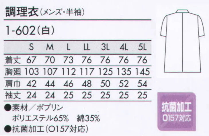 調理衣(メンズ・半袖) 住商モンブラン1-602のサイズ表