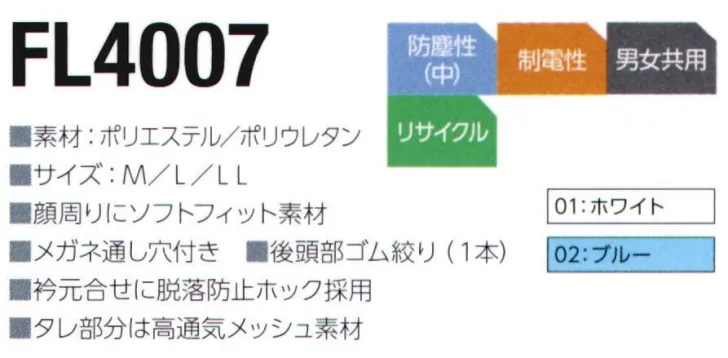 ■形状特長顔周りにソフトフィット素材、メガネ通し穴付、王東部ゴム絞り(1本)、衿元合わせに脱落防止ホック採用、タレ部分は高通気メッシュ素材