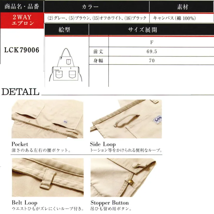 2WAYエプロン LeeLCK79006-Bのサイズ表