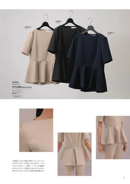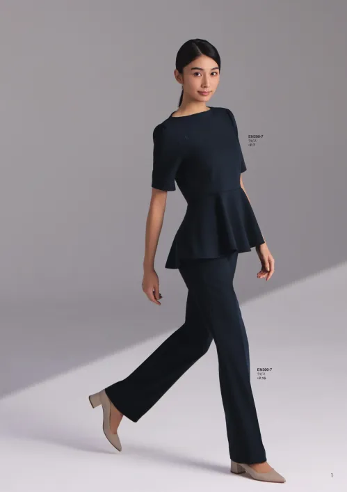 ESTNATION×FOLKのコラボレーションシリーズ。ウエストの切り替えから広がるペプラムシルエットで、洗練された美しさと体型カバーを両立。ポリエステル100%のESリュクスモーション素材を使用し、軽やかな着心地と上品な佇まいでおもてなしの所作を優雅に演出します。