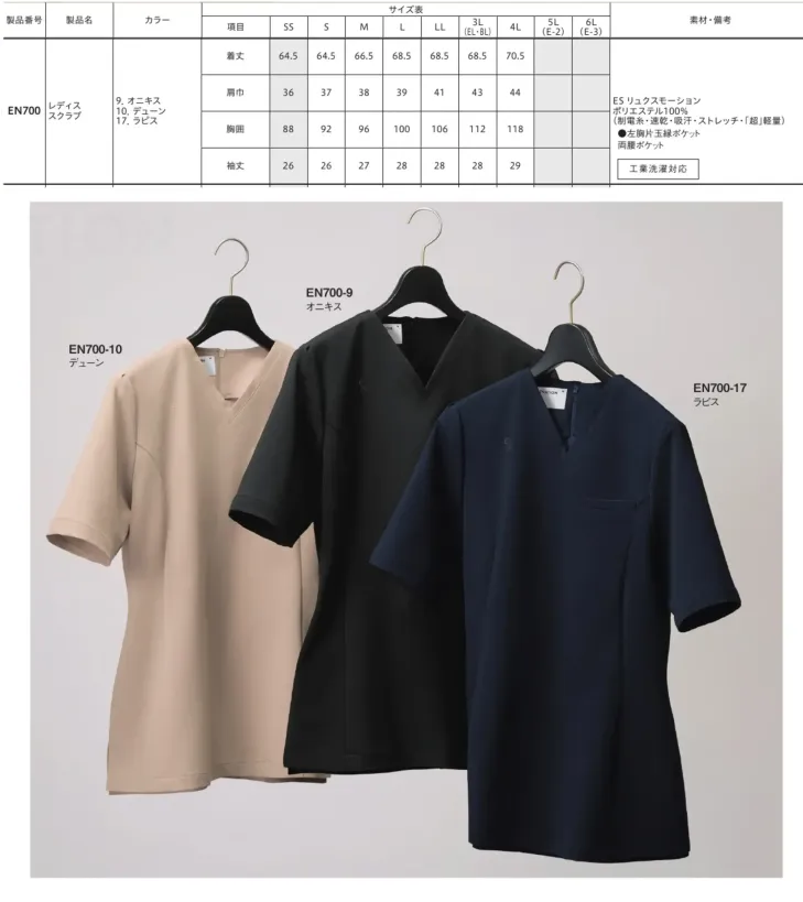 「ESTNATION×FOLK」のコラボレーションシリーズで、ミニマルなデザインに品格を与える細部へのこだわりが、プロフェッショナルな仕事を支えるレディススクラブです。ESリュクスモーション(ポリエステル100%)素材を採用し、上質な着心地を実現します。