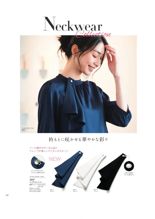首元に洗練された華やかさを添えるパール調ボタン付きワンタッチスカーフ。上品なドレープが魅力で、カウンター業務や接客シーンに気品ある印象を与えます。