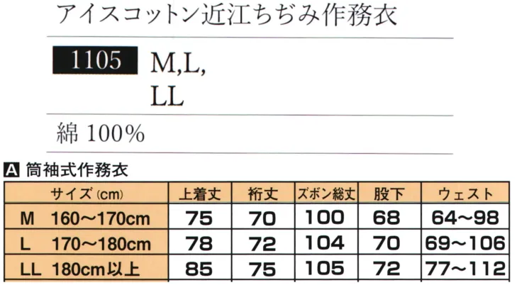 アイスコットン近江ちぢみ作務衣 伊田繊維1105のサイズ表