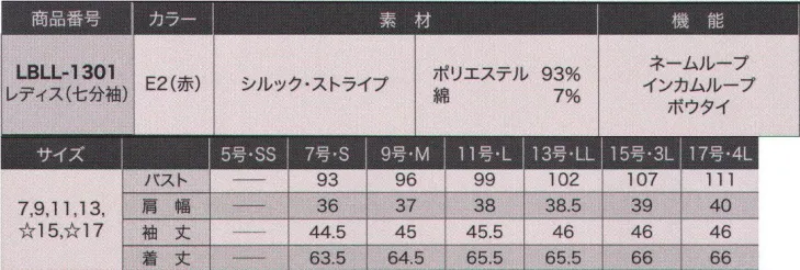 ブラウス(七分袖) サーヴォLBLL-1301のサイズ表