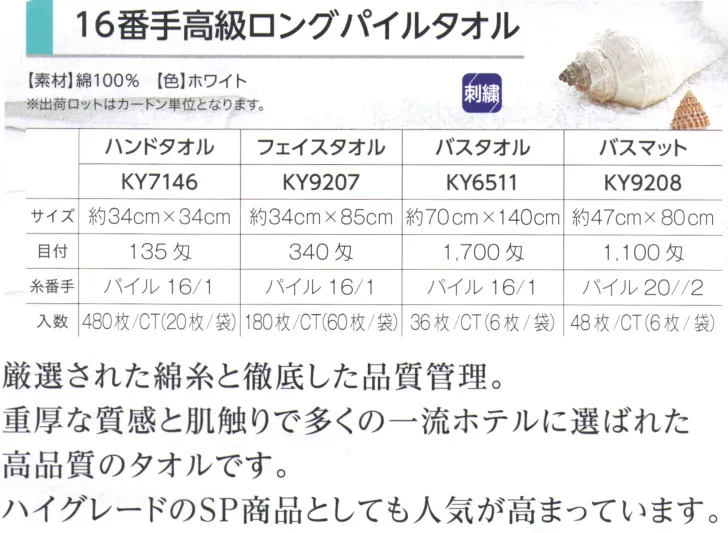 厳選された綿糸と徹底した品質管理。重厚な質感と肌触りで多くの一流ホテルに選ばれた高品質のタオルです。ハイグレードのSP商品としても人気が高まっています。