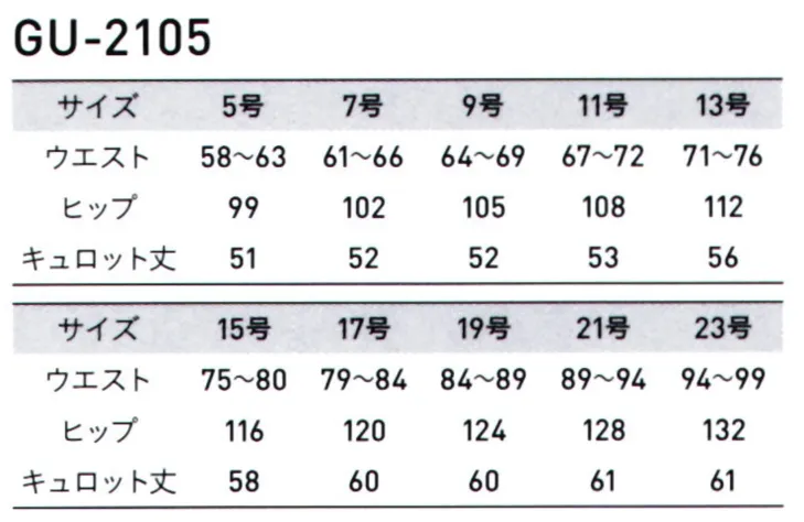ワンタックレディースチノキュロット アルトコーポレーションGU-2105のサイズ表