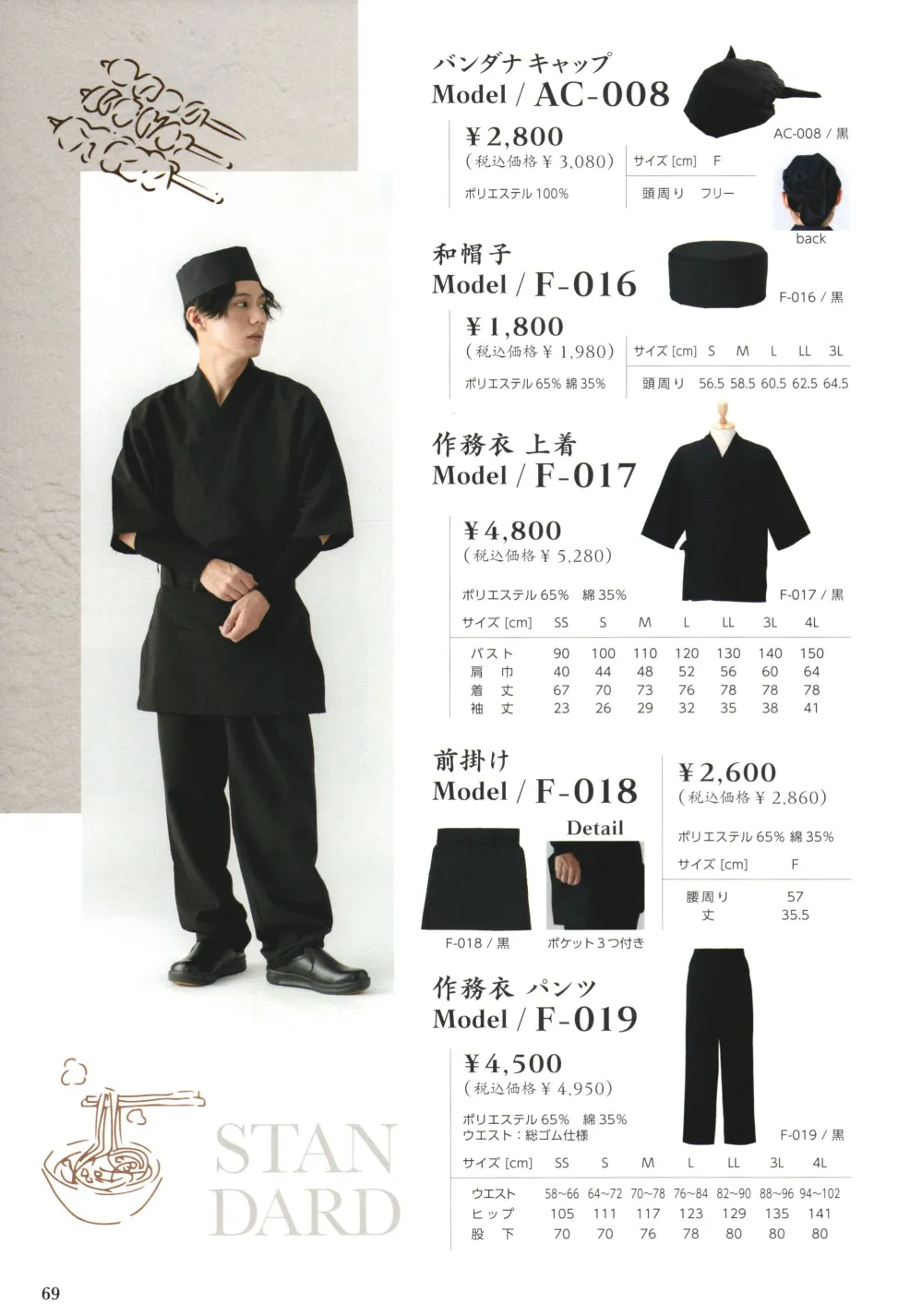 同素材のバンダナキャップ、作務衣上着、作務衣パンツ、前掛けも取り揃えております。