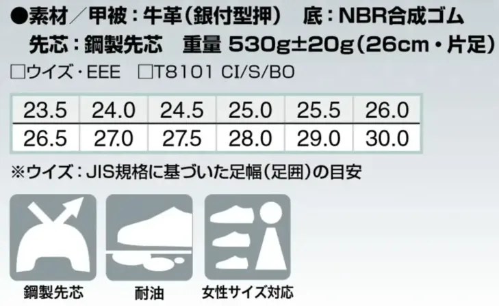製造業向けに設計された耐久性に優れた日本製セーフティシューズ。牛革アッパーと鋼製先芯を採用し、約530gのしっかりとした重量設計で高い保護性能を実現。耐油性に優れたNBR合成ゴム底と直接加硫圧着製法により、長く安心して使える一足です。