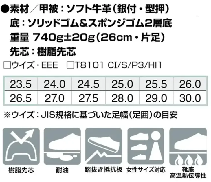 JISのトップレベルをクリアした最高性能の日本製安全靴。踏抜き防止板がシリーズ全ての商品に導入されているのでしっかりと足を守ってくれます。ゴム2層で屈曲性に優れ、足馴染みが良いことから長時間でも快適に作業ができます。