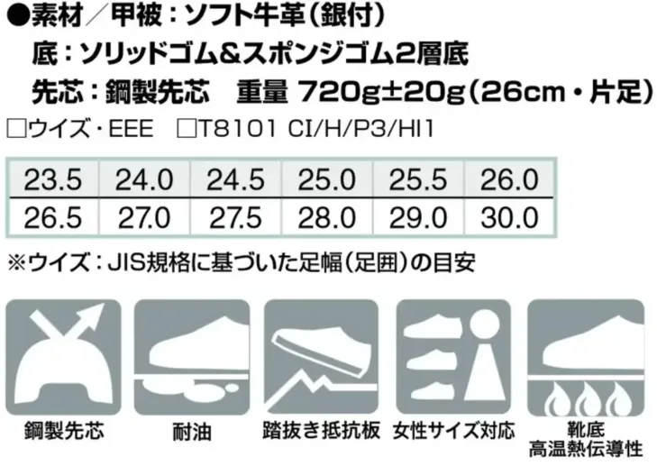 ■使用素材甲被:ソフト牛革(銀付) 底:ソリッドゴム&スポンジゴム2層底 先芯:鋼製先芯