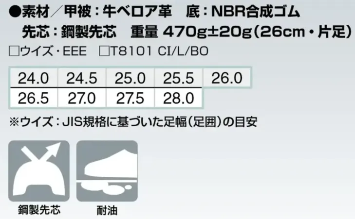 ■使用素材甲被:牛ベロア革 底:NBR合成ゴム 先芯:鋼製先芯