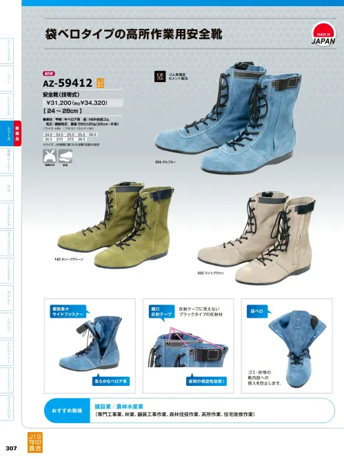 高所作業に求められる安定性と快適性を追求した日本製安全靴AZ-59412。鋼製先芯による確かな保護性能に加え、袋ベロ仕様で異物の侵入を防止。柔らかな牛ベロア革と軽量約550g設計により足にフィットし、長時間でも疲れにくく安全で快適な作業を支えます。