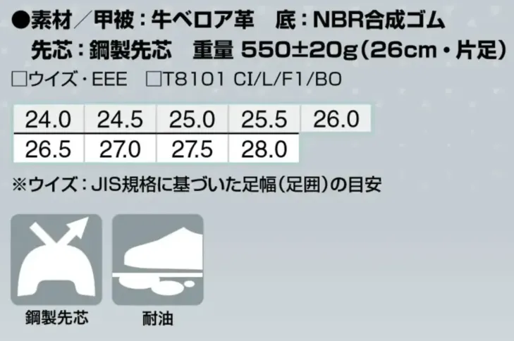 ・鋼製先芯を採用し落下物や衝撃からつま先を保護