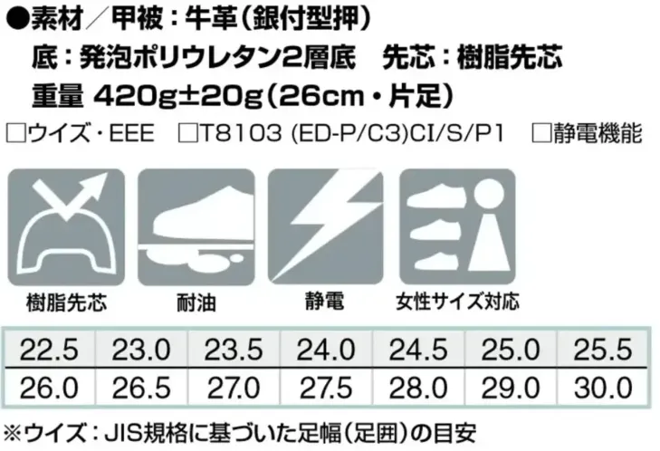 衝撃吸収性と軽量性を兼ね備えた安全靴。ウレタン2層底インジェクション製法と片足約420gの軽量設計により、足への負担を軽減しつつ安定した履き心地を実現。JIS T8103適合の安全性能で、長時間の作業でも安心して使える快適な一足です。