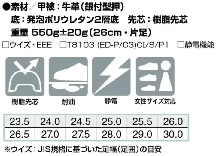 衝撃吸収性と軽量性を兼ね備えた安全靴。ウレタン2層底インジェクション製法と片足約550gの軽量設計により、足への負担を軽減しつつ安定した履き心地を実現。JIS T8103適合の安全性能で、長時間の作業でも安心して使える快適な一足です。