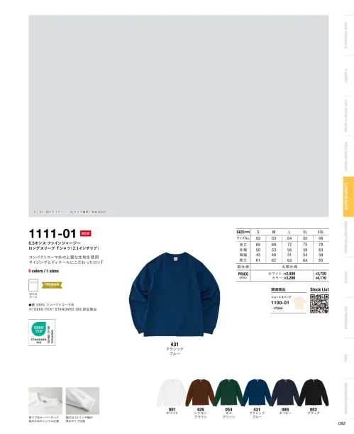 1111-01 6.5オンス ファインジャージー ロングスリーブ Tシャツ(2.1インチリブ)