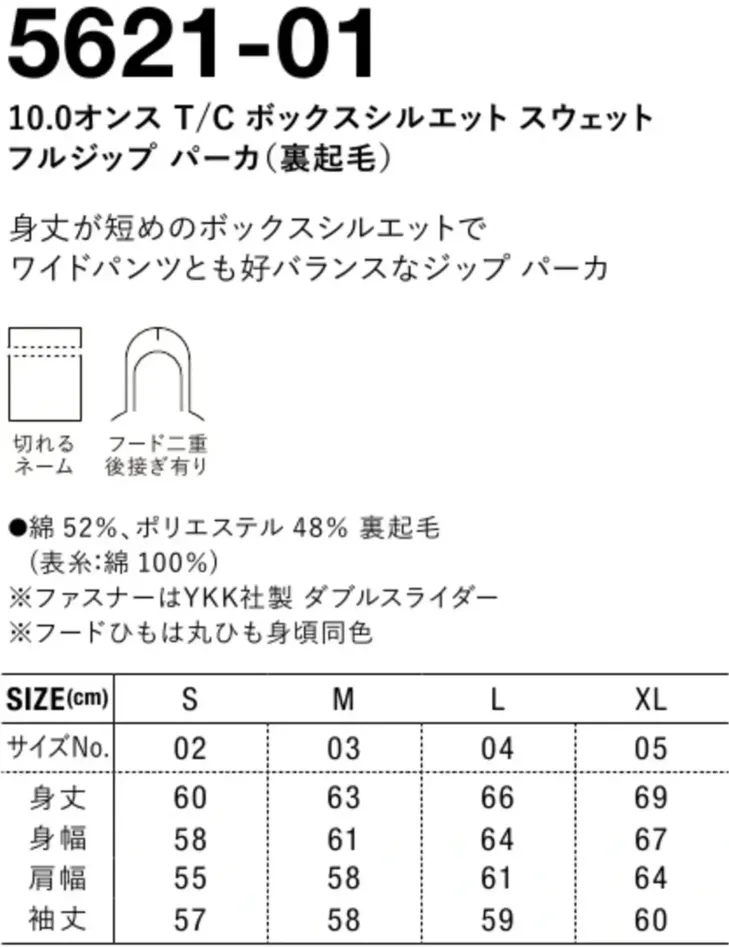 5621-01 10.0オンス T/C ボックスシルエット スウェット フルジップ パーカ(裏起毛)