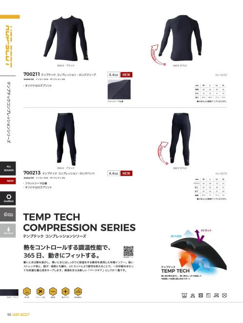 コンプレッションインナーとして、暑い時は熱を逃がし寒い時は保温をサポートするTEMP TECH素材を採用したロングパンツです。高いストレッチ性と吸汗速乾性を発揮し、UVカット機能も備えて一年を通して快適に体へフィットします。