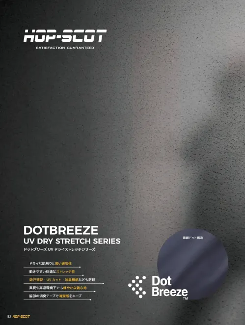ドライな感触と高通気性、そして快適なストレッチ性を兼ね備えたジョッパーズカーゴパンツ。微細ドット構造により空気の流れを生み出し、吸汗速乾とUVカット機能を発揮。約3.7ozの軽量素材でムレやベタつきを抑え、暑い現場でも快適なはき心地をキープします。