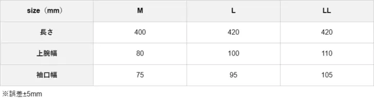 デュラカット耐切創アームカバー レベルE CUC780052のサイズ表