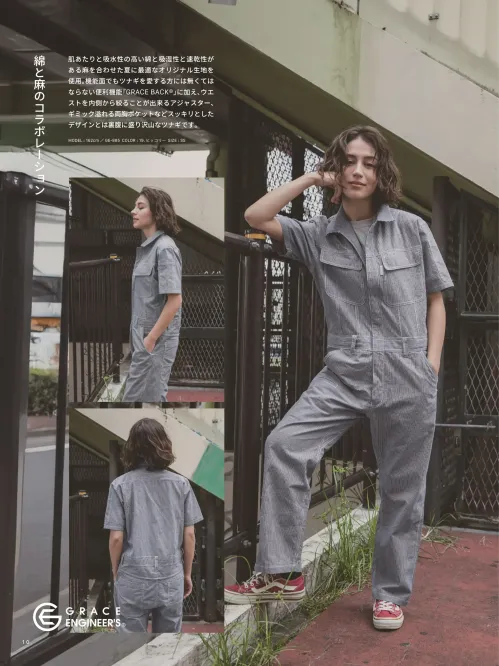 肌あたりと吸水性の高い綿と吸湿性と速乾性に優れた麻を組み合わせたGRACE ENGINEER'Sの半袖ツナギ。綿75%・麻25%の約170g/㎡生地により、通気性と軽やかな着心地を実現。ヒップオープン機能GRACE BACK®で上着を脱ぐ手間なくスムーズにお手洗いができ、夏場の作業を快適にサポートします。
