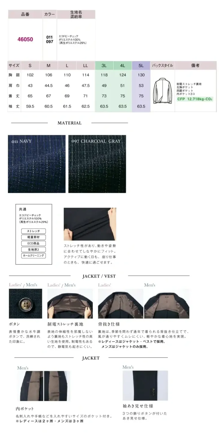深みのあるカラーと繊細なチェック柄が特徴のメンズジャケット。ポリエステル100%ながらウールのような手触りを実現し、軽やかで高級感のある着心地を提供します。環境に配慮した素材でサステナブルかつ快適な着用感が魅力です。