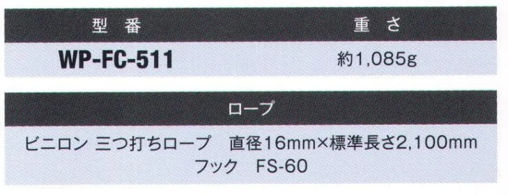 ■形状特長ローブ:ビニロン 三つ打ちローブ 直径16mm×標準長さ2,100mm フック:FS-60
