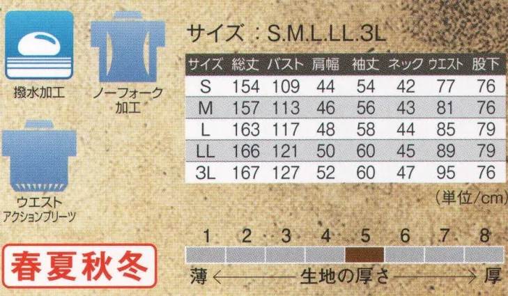 ワークステージを選ばない、動きやすさと着心地の良さ。ゆったりとした着心地で、腕の動きもスムーズ。肩の窮屈感を無くす加工を施し、どんな動きにも対応します。ウエスト部分にプリーツと呼ばれる伸縮加工と特殊ゴムを採用。ウエスト部分を閉め過ぎず、動きやすさが向上します。