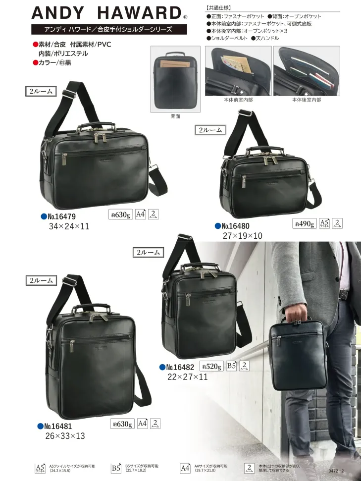 ANDY HAWARDの合皮手付ショルダーシリーズのA5コンパクトモデルです。サイズ27×19×10cm 重量約490gの軽量設計に2ルーム構造を採用し 必要最小限の荷物をスマートに持ち歩けます。合成皮革とPVC素材の組み合わせで雨の日も安心して使用でき 内装のポリエステル素材が収納物を優しく保護する実用的なビジネスバッグです。