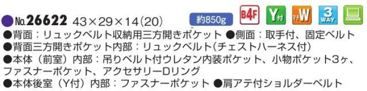 ■形状特長●正面:ファスナーポケット●背面:リュックベルト収納用三方開きポケット ●側面:取手付、固定ベルト
