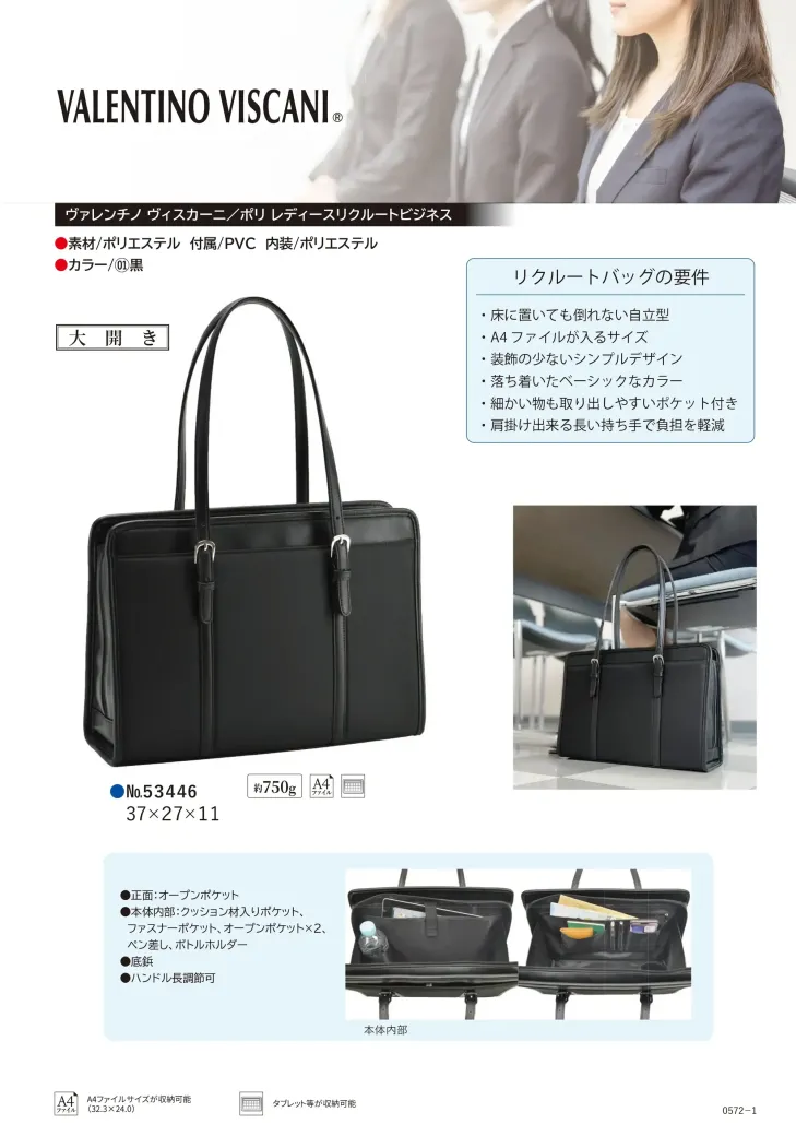 VALENTINO VISCANIブランドのレディースリクルートバッグです。サイズ37×27×11cm 重量約750gでA4ファイル対応の実用的な容量を確保しました。床に置いても倒れない自立型設計 装飾の少ないシンプルデザイン 落ち着いたベーシックなカラーなど リクルートバッグに求められる全ての要件を満たした就職活動やビジネスシーンに最適なバッグです。