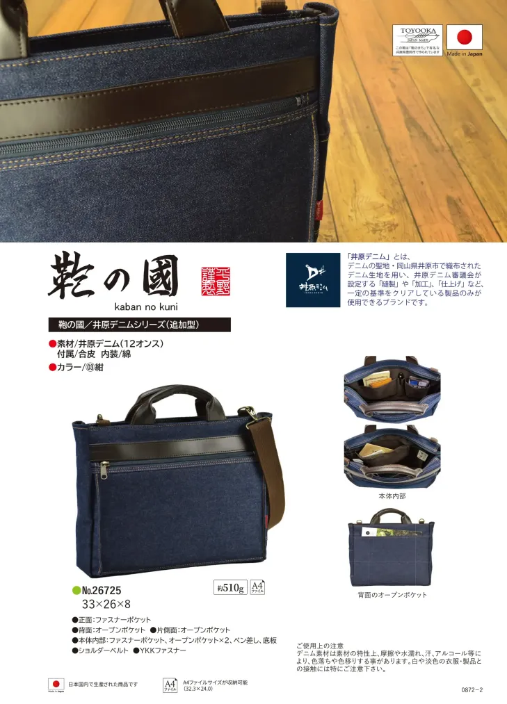 岡山県井原市で織られた井原デニム(12オンス)を使用した日本製ショルダーバッグです。TOYOOKA製鞄認定を受けた確かな品質と職人技が生み出す耐久性と高級感を備えています。A4ファイルサイズ対応で33×26×8cmの使いやすいサイズ設計により ビジネスシーンから普段使いまで幅広く活躍します。