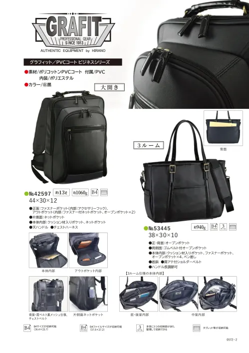 1913年創業HIRANOの本格ビジネスバッグブランドGRAFITのビジネストートバッグです。PVCコート素材を採用し水や汚れに強く約940gの軽量設計とB4ファイル対応サイズでビジネスシーンに必要な機能を凝縮しました。3ルーム構造と充実したポケット配置で使い勝手の良さを実現しています。