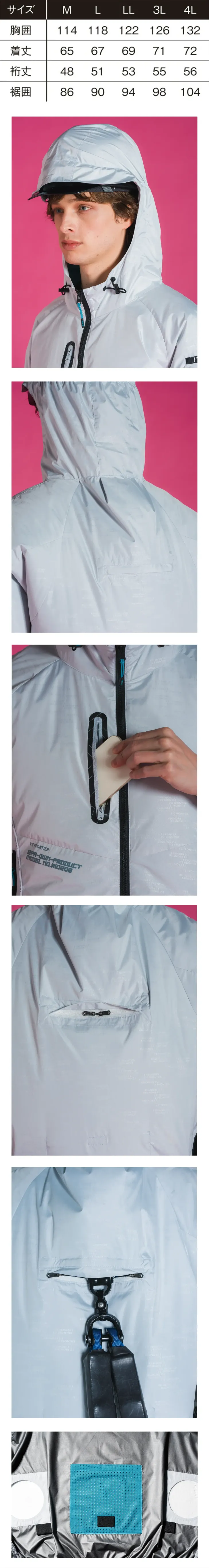 ■形状特長ヘルメットの上から被れるフード(視界広め)/スマホが入る縦ファスナー付き胸ポケット/衣服内を風が駆け巡る首後ろの立体構造(特許取得 第6601703号)/首後ろの空気の流れを作る二重構造/背中には空気を冷やす保冷剤ポケット/ファスナー付きランヤード取付口