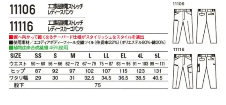 エコ製品制電ストレッチレディースパンツ 自重堂11106のサイズ表