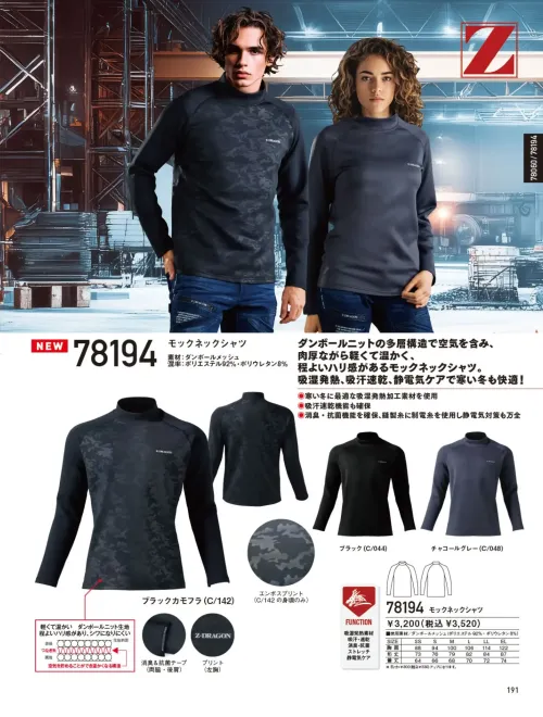 Z-DRAGONの高機能インナーシャツはダンボールメッシュの多層構造により空気層を形成し優れた保温性を実現しました。ポリエステル92%・ポリウレタン8%の素材配合で程よいハリ感と適度なストレッチ性を両立し吸湿発熱と吸汗速乾機能により寒い冬場の作業も快適にサポートします。肉厚ながら軽量で動きやすく長時間着用しても疲れにくい着心地を提供します。