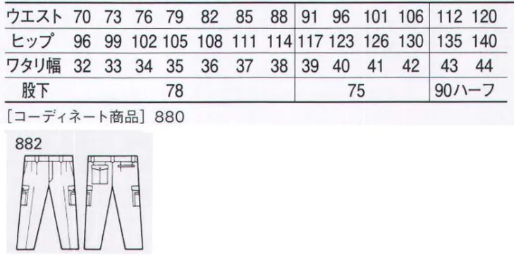 防汚加工ツータックカーゴパンツ 自重堂882のサイズ表