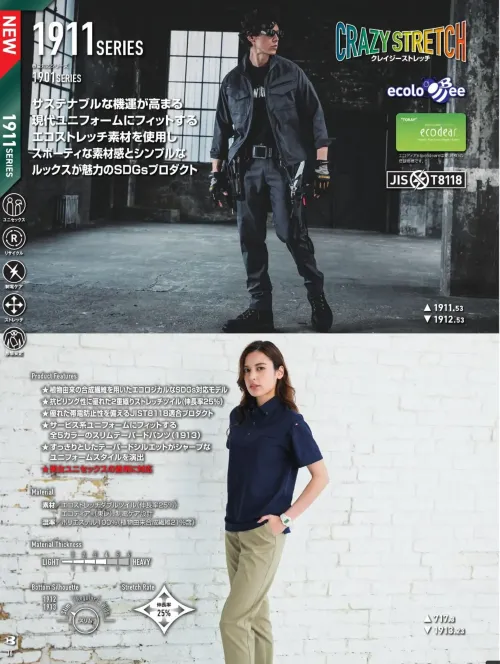 サステナブルな機運が高まる現代ユニフォームにフィットする1911シリーズのスリムテーパードパンツです。植物由来の合成繊維を用いたエコロジカルなSDGs対応モデルで抗ピリング性に優れた2重織りストレッチツイル(伸長率25%)を採用。優れた冷蔵防止性を誇るJIST8118適合プロダクトとして機能性とスタイリッシュさを両立させました。
