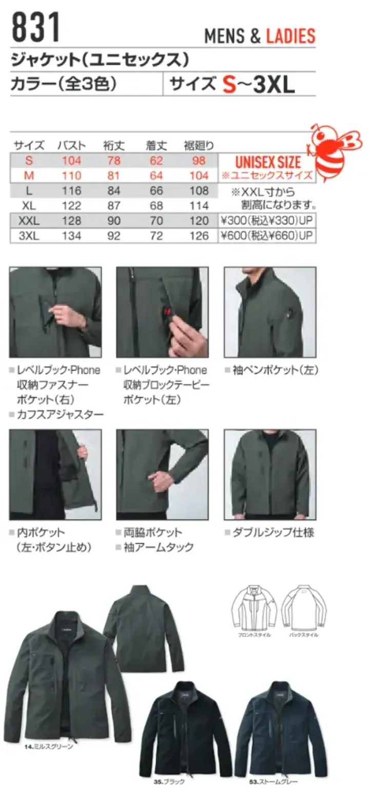 ほどよい保温性とストレッチ性を兼ね備えた831シリーズの限定版ジャケットです。2層式ライトツイルストレッチ素材を採用し、タテ約420%×ヨコ約30%という驚異的な伸縮率を実現。スポーティなルックスと抜群の動きやすさで、ハードな作業現場でも快適な着心地を提供します。