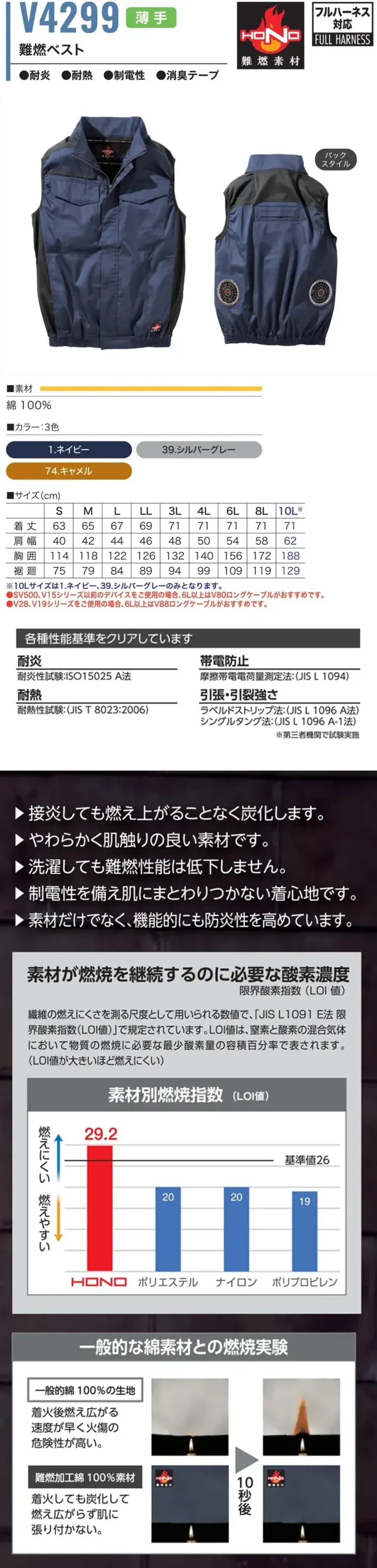 難燃ベスト(ファン・バッテリー別売) 村上被服V4299のサイズ表