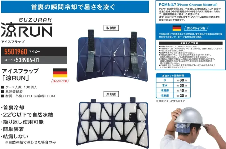 首裏を瞬間冷却し暑さを軽減するアイスフラップ「涼RUN」は、約22℃以下で自然凍結するPCM素材を採用し、効率的なクールダウンを実現。ヘルメットに簡単装着でき、炎天下の現場作業でも快適な冷却効果を発揮します。